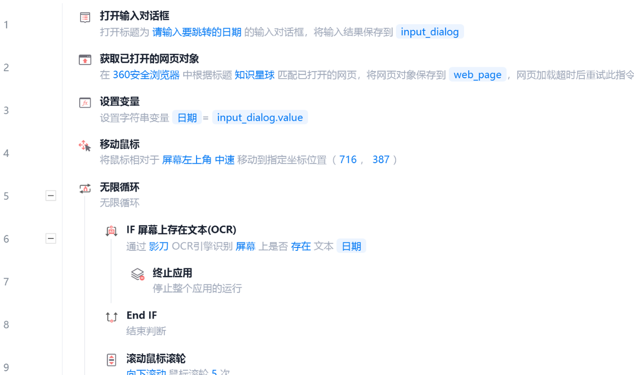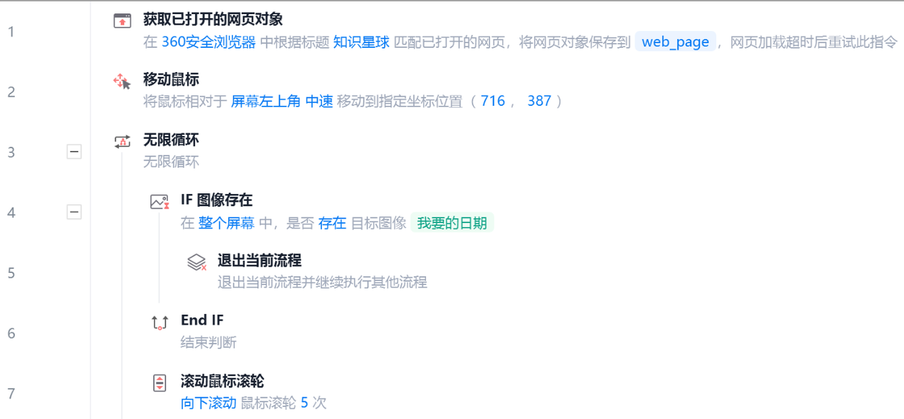 (4)用【无限循环】、【IF屏幕上存在文本(OCR)】和【滚动鼠标滚轮】指令,无限下拉判断页面是否存在该日期文本,存在即退出,不存在就继续滚动页面判断,