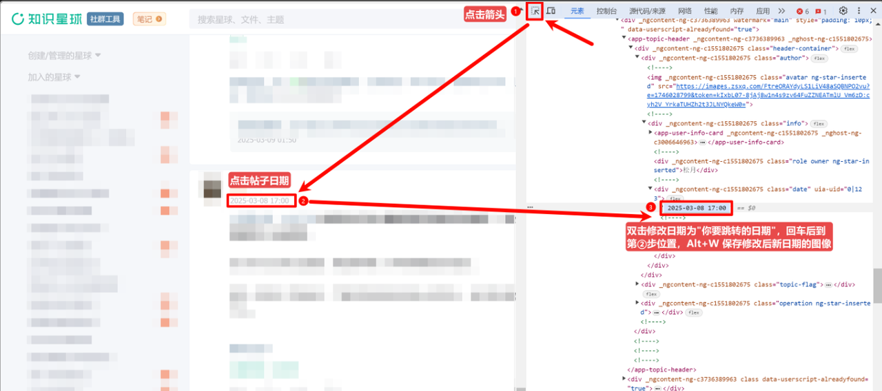 (2)在知识星球页面,按F12/审查元素打开开发者工具,找到任意一个帖子日期,改成你要跳转的日期,回车更改日期生效;