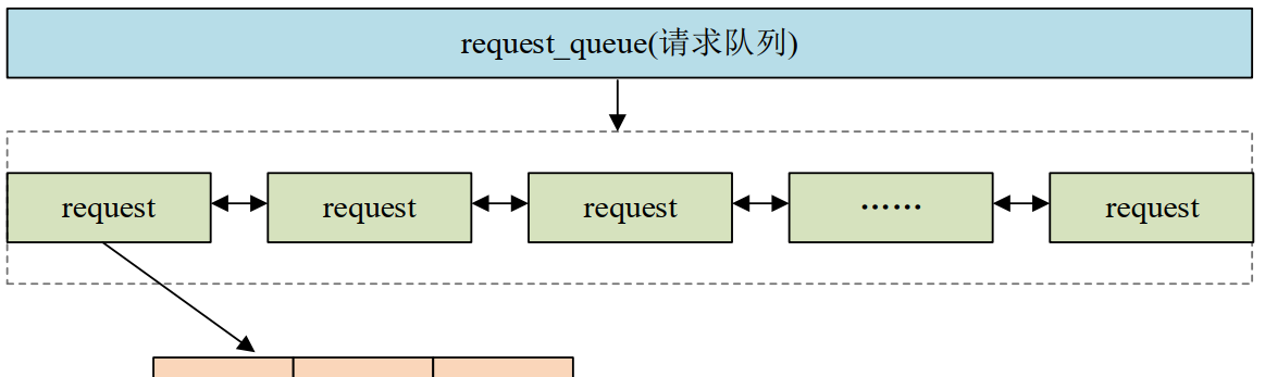 每个 request 里面里面会有多个 bio, bio 保存着最终要读写的数据、地址等信息。上层应用程序对于块设备的读写会被构造成一个或多个 bio 结构, bio 结构描述了要读写的起始扇区、要读写的扇区数量、是读取还是写入、页偏移、数据长度等等信息。上层会将 bio 提交给 I/O 调度器, I/O 调度器会将这些 bio 构造成 request 结构,而一个物理存储设备对应一个 request_queue,request_queue 里面顺序存放着一系列的 request。新产生的 bio 可能被合并到 request_queue 里现有的 request 中,也可能产生新的 request,然后插入到 request_queue 中合适的位置,这一切都