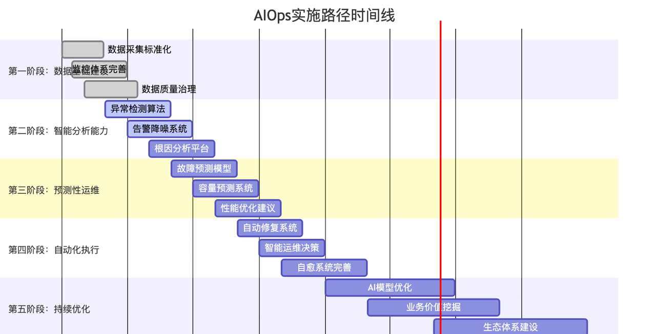 第五阶段:智能化运维(2020年至今) – 特点:AI技术深度融合,智能决策和自动执行 – 工具:机器学习平台、AIOps解决方案 – 愿景:实现自主运维和业务价值最大化