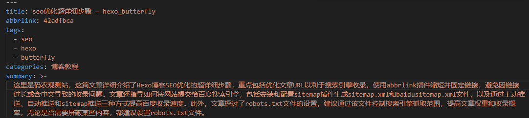 summary_field:设置写入到文章顶部字段的名称,比如我这里默认是summary,最终实现的结果就是在文章顶部插入一个字段为:summary的摘要文本: