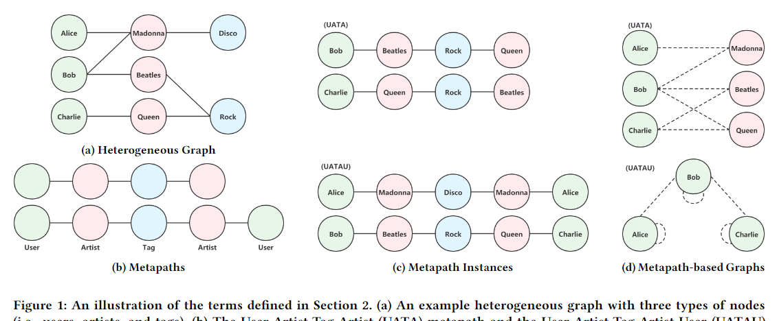 例如,在图 1 中考虑元路径 UATA,艺术家 Queen 是用户 Bob 的一个基于元路径的邻居。这两个节点通过元路径实例 Bob → Beatles → Rock → Queen 相连。此外,Beatles 和 Rock 被称为该元路径实例中的中间节点。