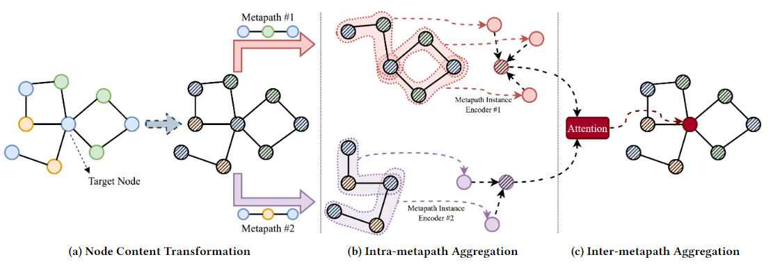 (2)模型在处理元路径时丢弃了所有中间节点,只考虑元路径两端的节点,这会导致信息丢失。例如 HERec [23] 和 HAN [31] 就存在这个问题。