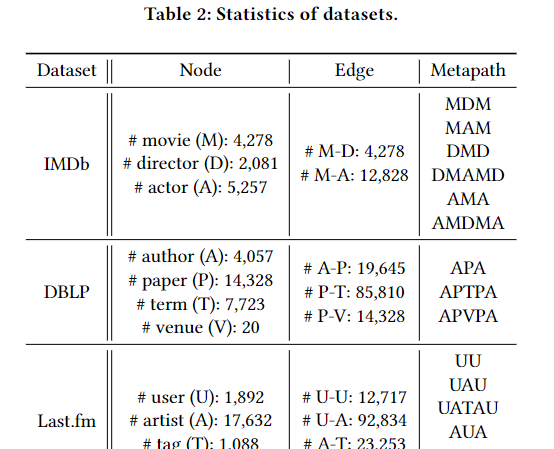 (1)模型未利用节点内容特征,因此在具有丰富节点属性的异构图中表现较差。例如 metapath2vec [9]、ESim [22]、HIN2vec [11] 和 HERec [23] 都没有充分利用节点的内容信息。