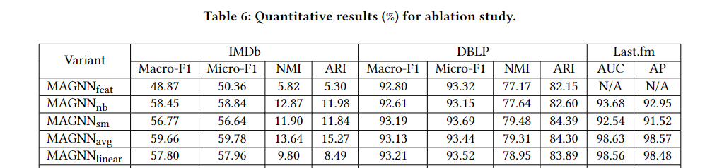 为了验证我们模型各个组件的有效性,我们在三个数据集上、三个任务中对不同的 MAGNN 变体进行了消融实验,结果列于 表 6 中。