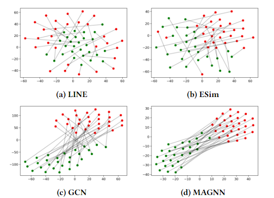 在图 Figure 4 中展示了 LINE、ESim、GCN 和 MAGNN 的可视化结果: