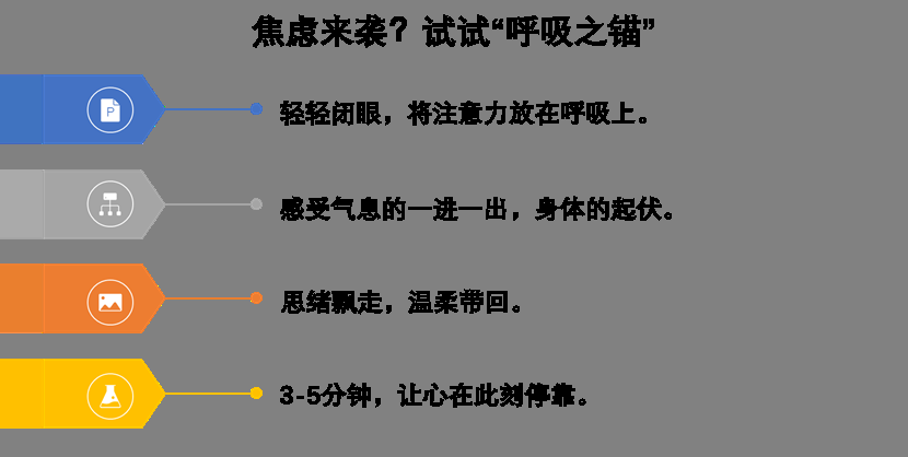 这是最基础也最核心的正念练习。无论何时何地,当你感到心烦意乱、焦虑不安时,都可以用它来帮助自己快速回到当下。
