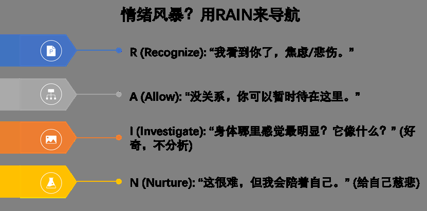 失业带来的负面情绪(如悲伤、愤怒、恐惧、羞耻)是不可避免的。RAIN法则是心理学家塔拉·布拉奇(Tara Brach)提出的一个强大的正念工具,帮助我们以慈悲和智慧的方式应对这些情绪。