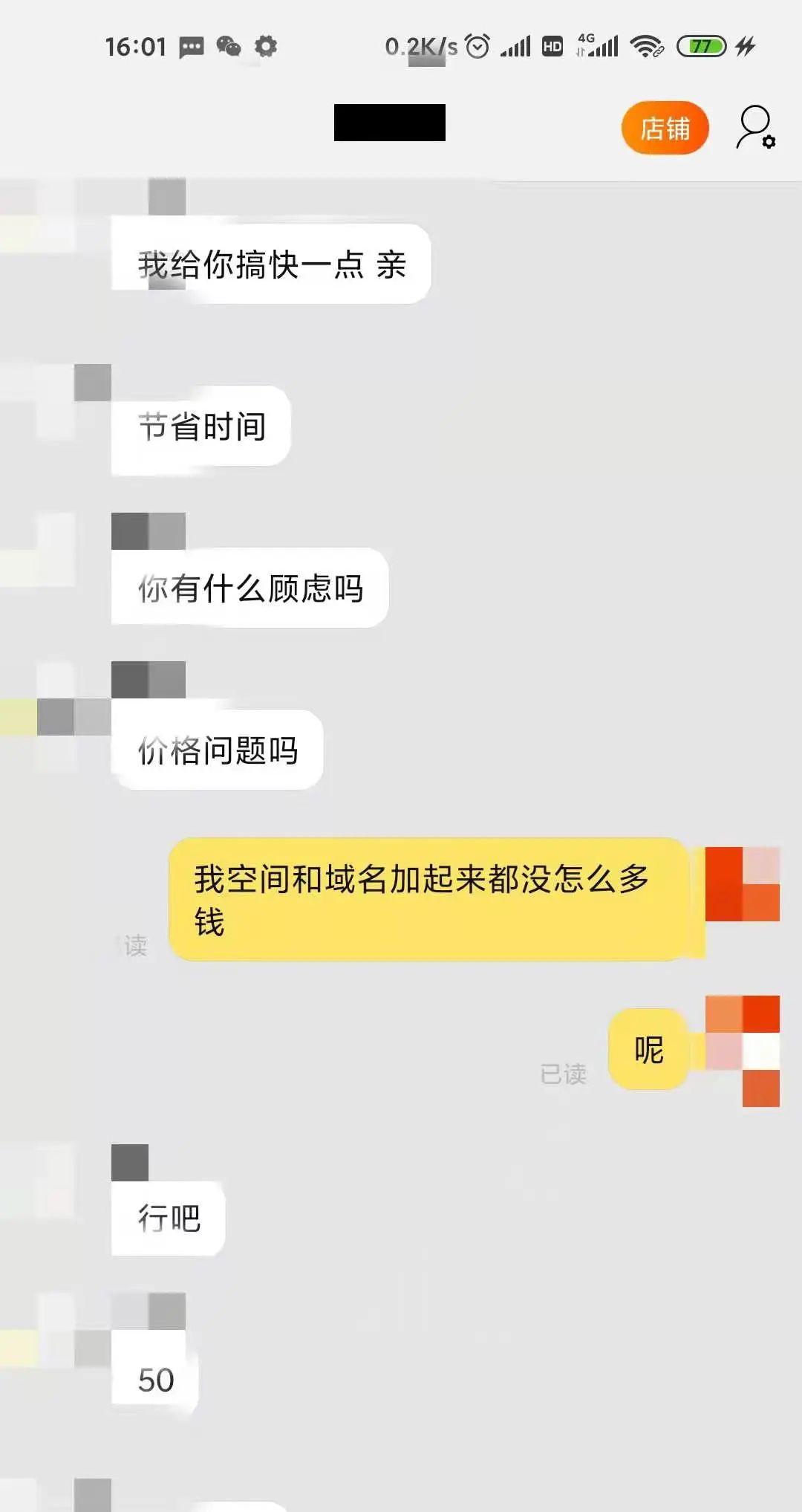 后面去万能的某宝上问。第一个人开价200元,第二个人开价100元,然后我说我域名和空间加在一起都没有100元,人家可能也忙直接说50元帮搞,这么好赚,我都想开淘宝店了,毕竟吃技术饭的,理解。