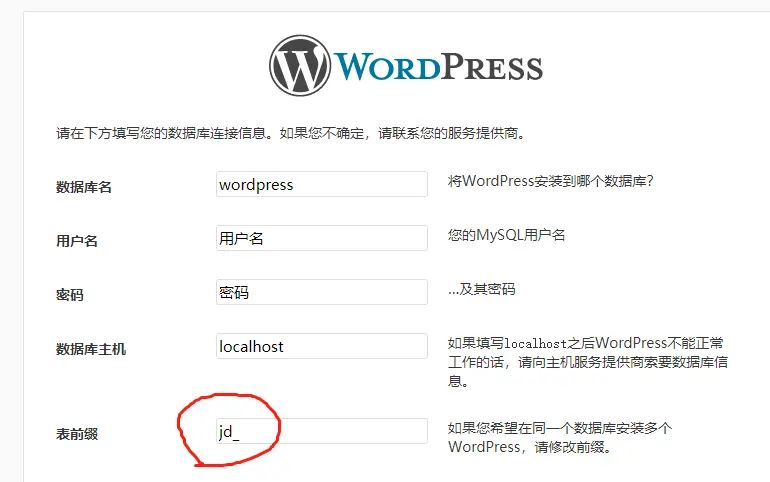 我自己设置的是jd,而wordpress默认的表前缀是wp,修改方法也简单,鼠标双击名称进入编辑,空白处再点击完成或按Esc,也就是把wp改成我设置的jd。