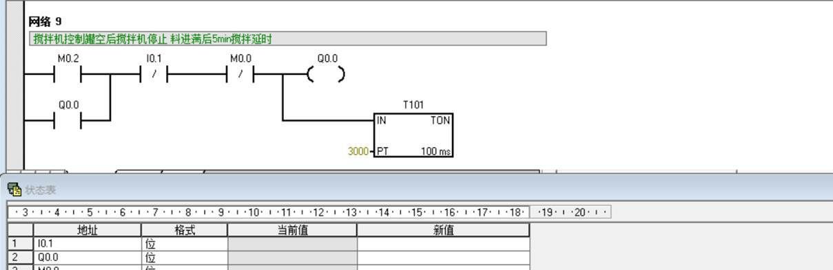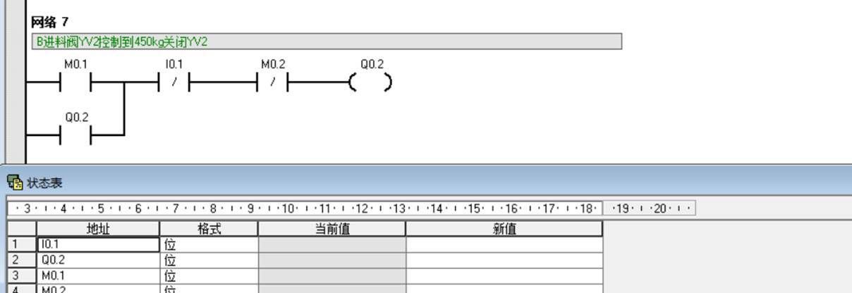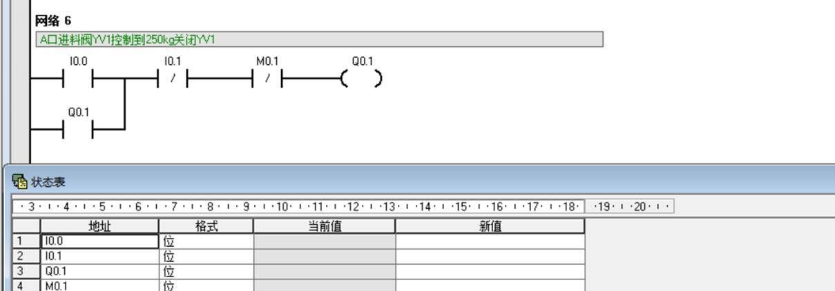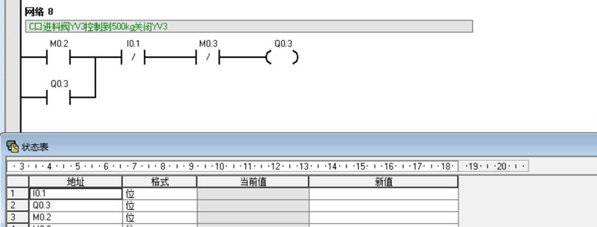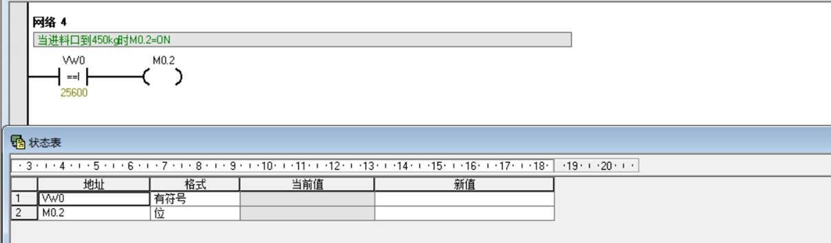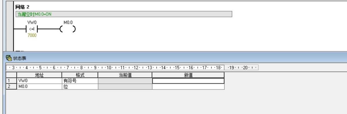 当VW0中的数据=7000时,比较触电[2]辅助器触电M0.0[2]得电,表明储料罐处于清空得状态。