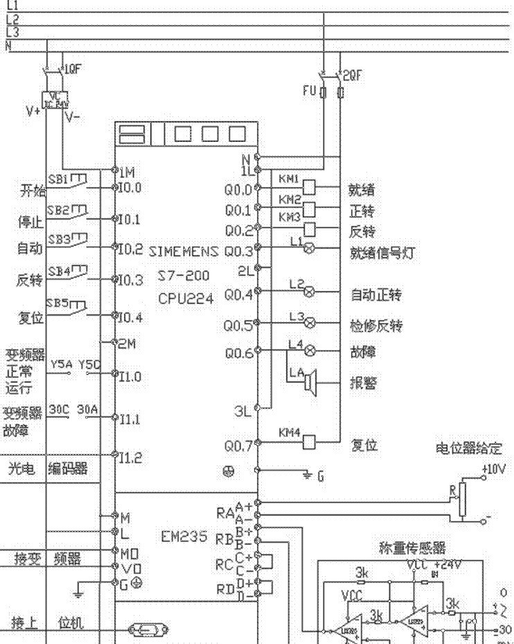 电机点动由 SB2 控制,用于检测电机能否正常启动,SB2 闭合,KM2 吸合,电机进入点动状态,若启动异常,报警器限时后声光报警。起动控制由 SB3 控制,SB3 闭合时,KM3 吸合,变频器按设定参数执行电机启动。点动控制(检修反转)由 I0.3 经 SB4 完成,故障卡机时实现反转,通过 PLC 外部电位器输入,无需 PID 调节。