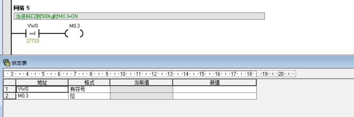 当VW0中数据等于27733时,比较触点[5]闭合,辅助继电器M0.3[5]得电,定时器开始延时5min。