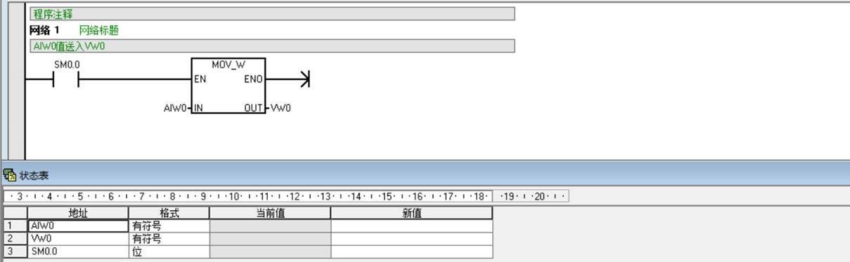 将信号送入AIW0中,通过传送指令,将AW0中的信号送入VW0中。
