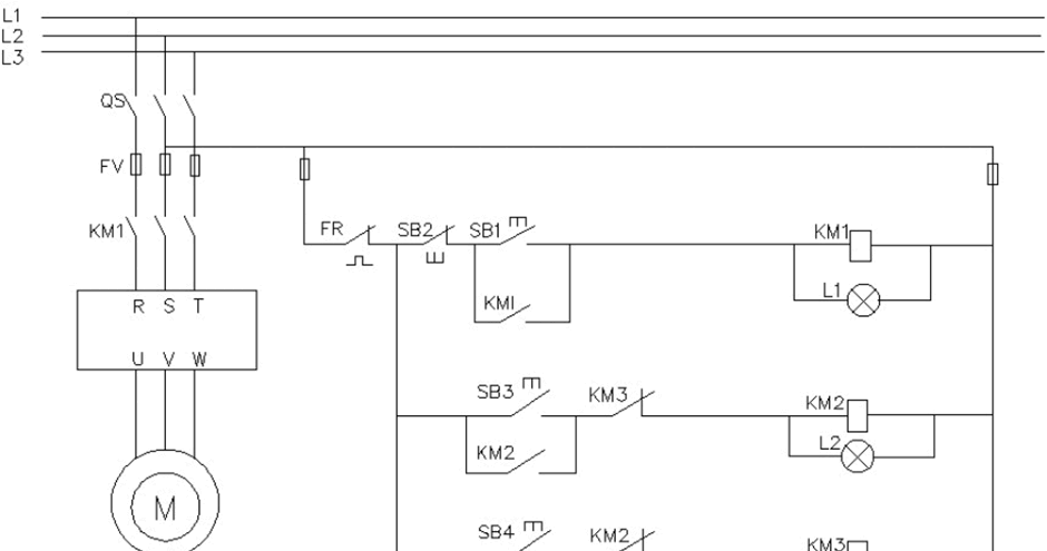 按钮 SB3(常开)与 KM3 常开辅助触点、KM2 常闭触点串联控制 KM2 线圈,SB4(常开)与 KM2 常开辅助触点、KM3 常闭触点串联控制 KM3 线圈,两者实现互锁,配合指示灯 L2、L3,可能用于控制电动机的不同运行模式,如正反转等,如图4.1所示。