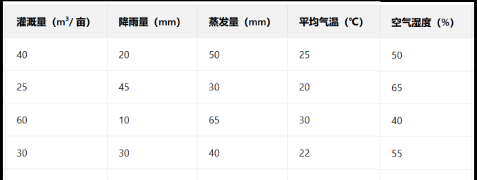 蒸发量(mm / 周期):水面蒸发量反映大气对水分的消耗(蒸发量每增加 10mm,灌溉需求增加 10-15m³/ 亩)。