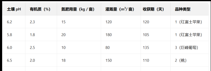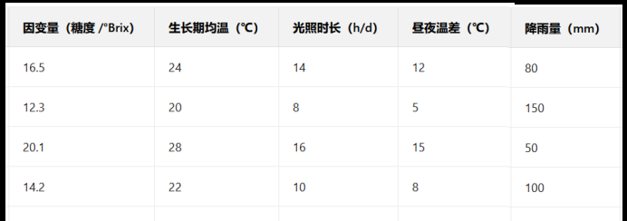降雨量(mm / 生长期):过量降雨可能导致果实裂果或糖分稀释