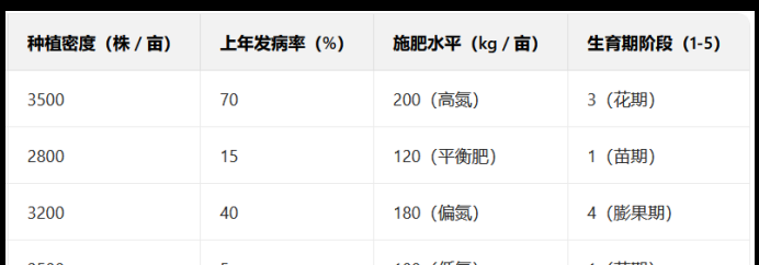 施肥水平(NPK 总量 /kg/ 亩):过量氮肥可能加剧病害(如水稻稻瘟病)。