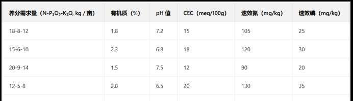 作物养分需求量:目标作物在特定生长阶段对氮(N)、磷(P₂O₅)、钾(K₂O)的需求量(单位:kg / 亩),或综合养分需求指数(可按 N-P₂O₅-K₂O 比例加权计算)。