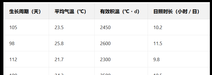 日照时长(小时 / 日):影响光周期反应和光合作用积累。