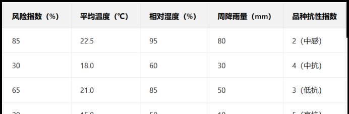 品种抗性指数:根据品种对特定病虫害的抗性评级(如 1-5 级,1 为高感,5 为高抗)。