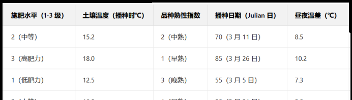 品种熟性指数:根据品种特性量化的成熟早晚指标(如早熟品种赋值 1,中熟 2,晚熟 3)。