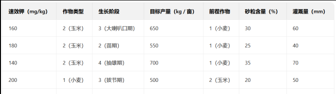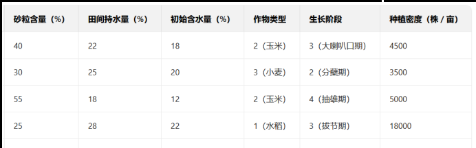 作物类型(编码值):如水稻 = 1(需水多),玉米 = 2,小麦 = 3(需水较少)。