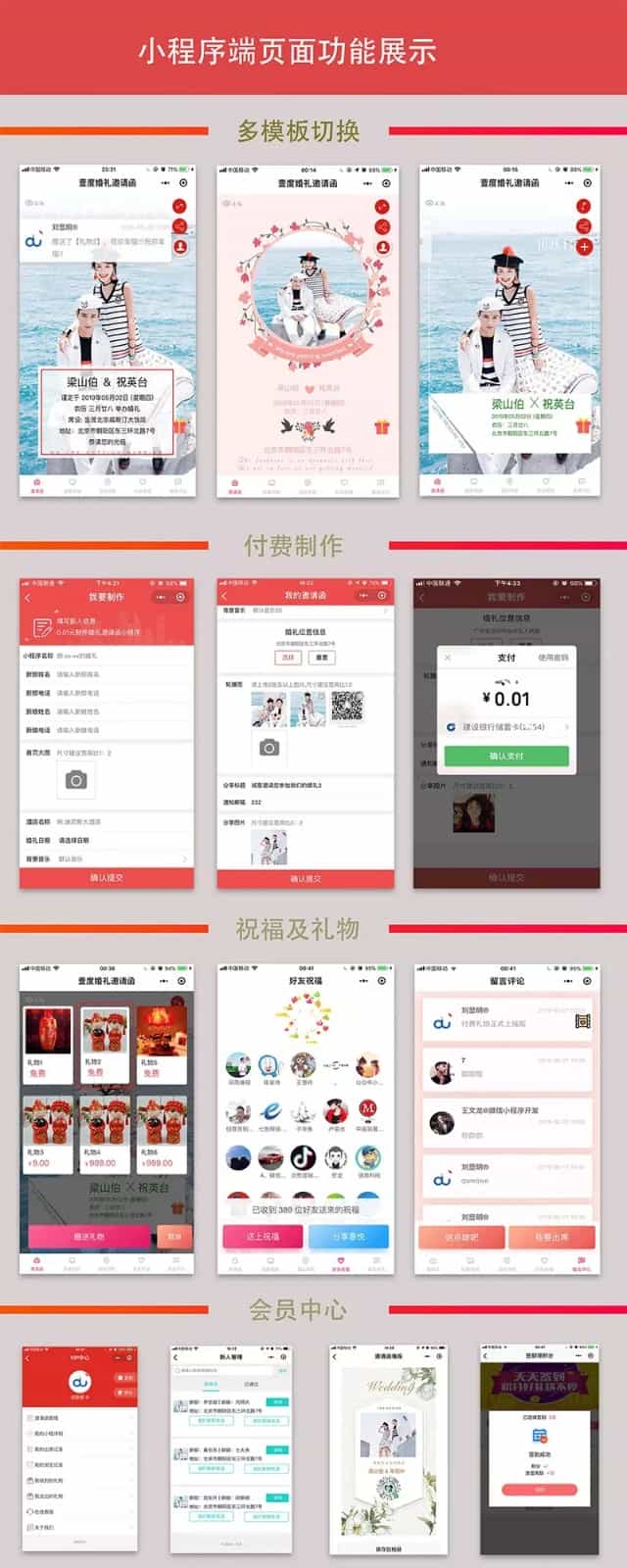 大概功能:多模板切换+付费礼物+MV弹幕+付费制作+消息推送+婚礼展示+酒店定位+点赞祝福+评论留言+出席申请+请贴海报+用户端管理 东西如下图: © 版权声明文章版权归作者所有,未经允许请勿转载。如内容涉嫌侵权,请在本页底部进入<联系我们>进行举报投诉!THE END资源下载 如果内容对您有所帮助,就支持一下吧!点赞11 分享QQ空间微博QQ好友海报分享复制链接收藏