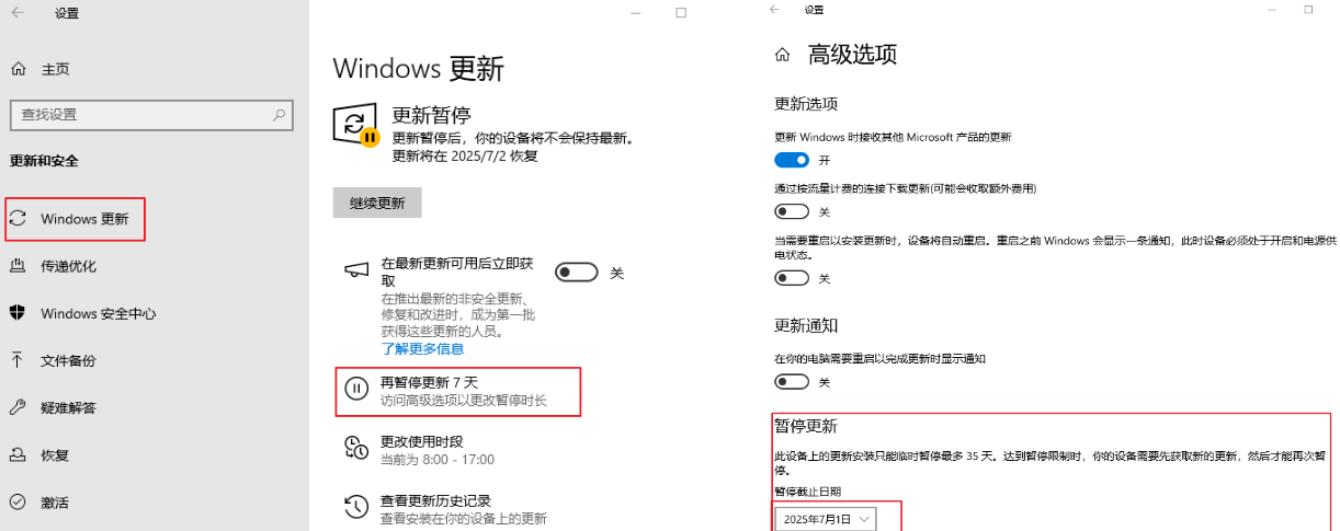 点击【暂停更新7天】(高级选项可设置最多暂停35天,企业版更长)