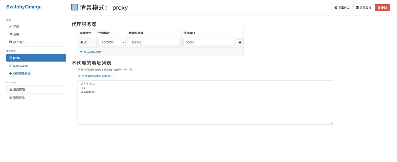 将代理进行如下配置,设置 SOCKS 代理,代理服务器为本机 127.0.0.1,代理端口为 30000。所有发送到远程服务器的流量从本地 127.0.0.1:30000 的流量通过 SSH 隧道转发到远程服务器。
