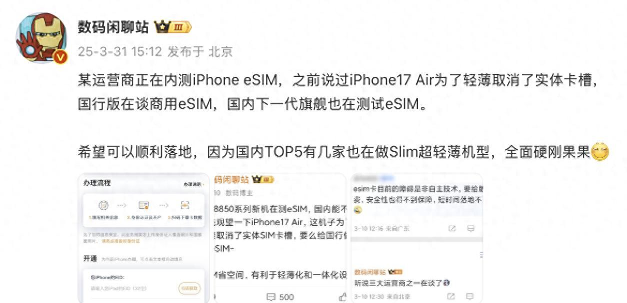 按照@数码闲聊站的说法,安卓阵营也有厂商尝试为搭载高通SM8850(第二代骁龙8至尊版)机型的加入eSIM,最快今年底上线,但eSIM能否落地还要看iPhone 17 Air。并且安卓厂商同样在开发轻薄款机型,撤销实体SIM卡槽转向eSIM的设计很可能会在轻薄机型上首发。