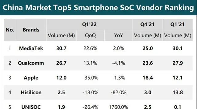 据市场研究机构 CINNO Research 的数据显示,2022 年第一季度,中国大陆市场智能手机 SoC 出货量约为 7439 万颗,同比下滑 14.4%,较去年第四季度环比微增 0.7%。其中,出货量的环比增加来自于联发科与高通的出货增加。
