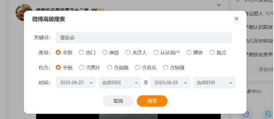 在弹出的高级搜索栏中输入筛选条件,如下案例为2023-9-23到2023-9-25这个时间段的全部亚运会关键词的博文 按搜索弹出结果