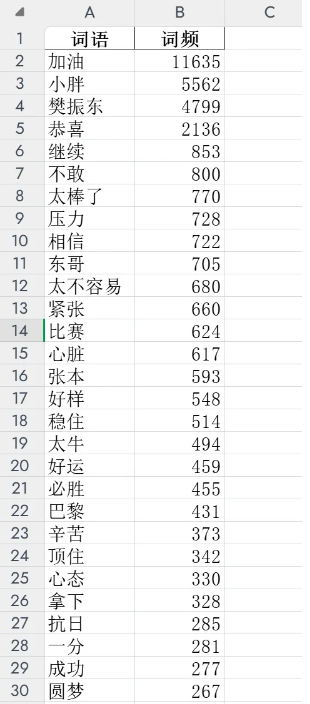 freq_df.to_csv(“亚运会评论词频统计.csv”, index=False, encoding='utf-8-sig')