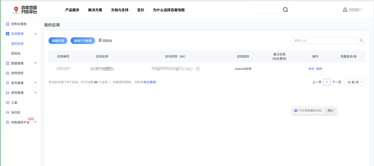 在百度地图开放平台控制台应用管理中创建Android端AK