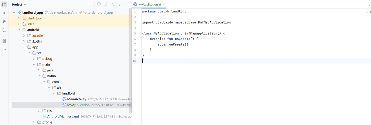 在 MainActivity 同级目录下创建 MyApplication.kt 文件,内容如下: