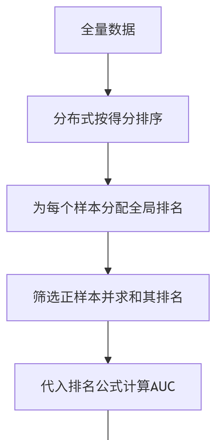 全局排序样本得分 → 正样本的排名和决定AUC(公式: AUC = ∑ 正样本排名 − 正样本数 ( 正样本数 + 1 ) 2 正样本数 × 负样本数 ext{AUC} = frac{sum ext{正样本排名} – frac{ ext{正样本数}( ext{正样本数}+1)}{2}}{ ext{正样本数} imes ext{负样本数}} AUC=正样本数×负样本数∑正样本排名−2正样本数(正样本数+1))。