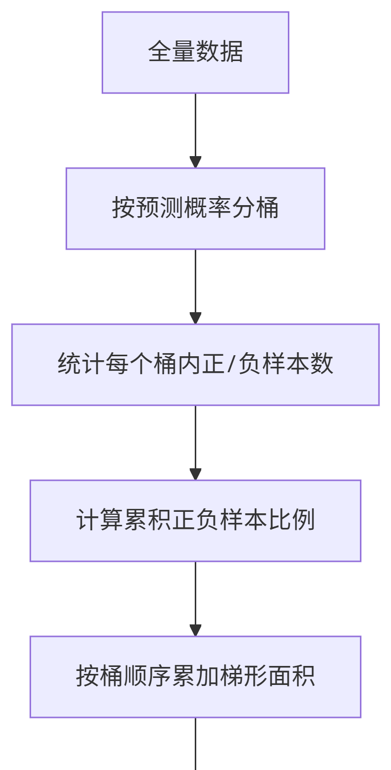 核心思想: 将预测概率分桶 → 统计桶内正负样本数 → 用梯形面积累加近似AUC。