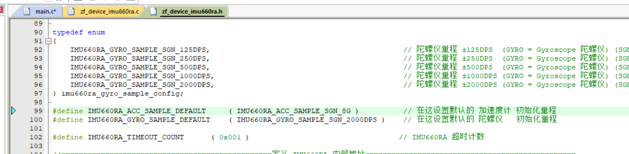 前面两个函数都只是从 IMU 的寄存器里直接取出值,并没有除以转换系数,所以单位是原始 ADC 值。 再看后面的注释,所以我们要去查看IMU660RA_GYRO_SAMPLE_DEFAULT宏的值,从而确定逐飞库寄存器初始化时到底设置了哪个量程,最后进行单位转化
