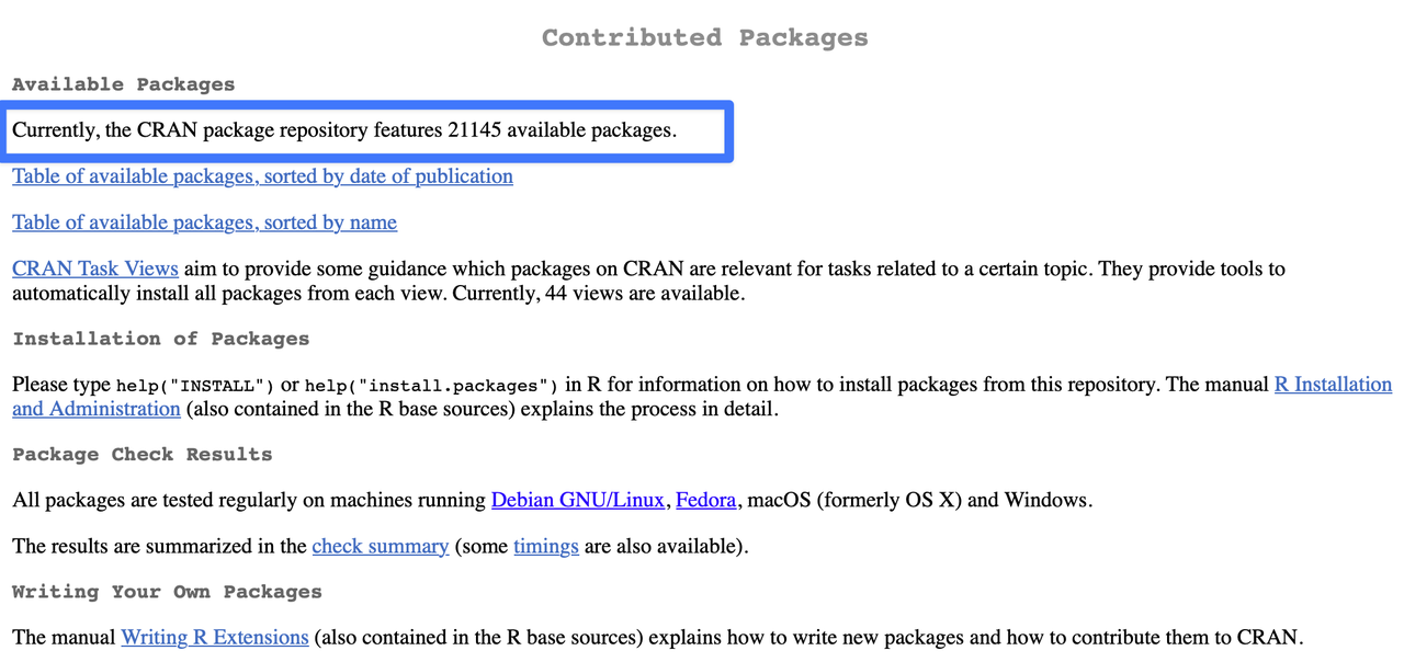 R语言社区的另一大贡献是综合R档案网络(Comprehensive R Archive Network,CRAN)的建立。CRAN由全球多个服务器组成,存储着相同的、最新版本的R代码和文档。CRAN的主要特点包括:作为中央存储库,CRAN托管了全球用户和贡献者开发的数万个R软件包(下图),便于用户下载和安装,增强R在统计计算和数据分析方面的功能;CRAN对软件包提交有严格的质量保证,每个软件包都经过严格审查,确保符合文档和功能标准,用户可以信赖CRAN上的软件包;CRAN还提供版本管理功能,使用户可以安装特定版本的软件包,确保数据分析的可重复性;此外,CRAN支持涵盖各种领域的广泛软件包,从统计建模、机器学习到数据可视化,满足不同用户的需求;开发者可以通过提交新软件包或更新来贡献于CRAN,遵守严格的质量和功能标准。