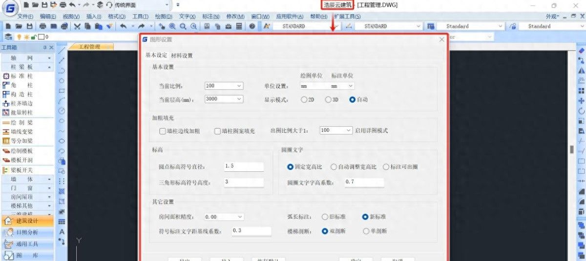浩辰CAD看图王(浩辰云建筑)CAD图形设置是管理图纸内的全局参数,包含基本设定和材料设定,如绘图的基本参数、墙体的加粗、填充图案等的设置。