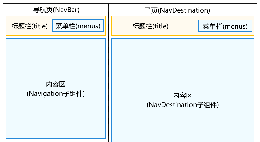Navigation组件主要包含导航页和子页。导航页由标题栏(包含菜单栏)、内容区和工具栏组成,可以通过hideNavBar属性进行隐藏,导航页不存在路由栈中,与子页,以及子页之间可以通过路由操作进行切换。