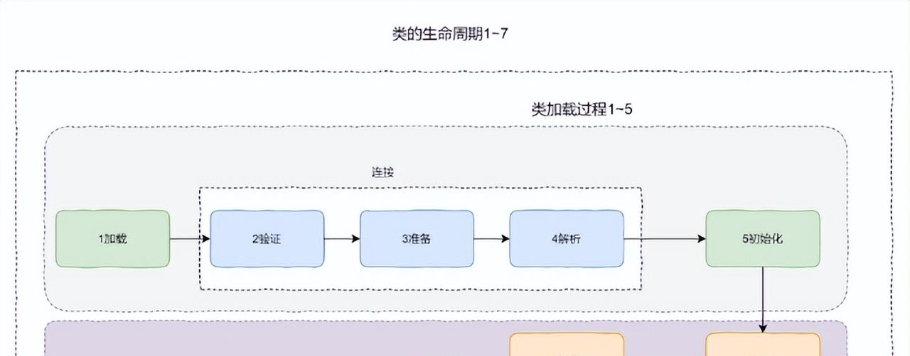类的生命周期一般有如下图有7个阶段,其中阶段1-5为类加载过程,验证、准备、解析统称为连接