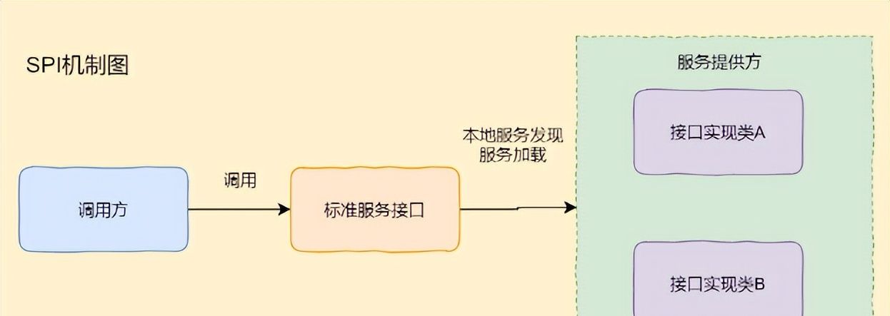 - SPI(Service Provider Interface)服务提供接口。它是jdk内置的一种服务发现机制,将装配的控制权移到程序之外,在模块化设计中这个机制尤其重大,其核心思想就是 让服务定义与实现分离、解耦。