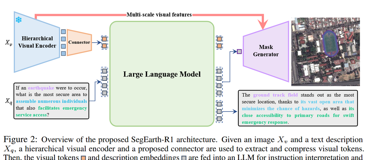 图2: 所提出的SegEarth-R1架构概述。给定一幅图像Xv和一个文本描述Xq,使用分层视觉编码器和一个所提议的连接器来提取和压缩视觉标记。然后,将视觉标记和描述嵌入输入到LLM中进行指令解析和语义关联。最后,描述嵌入直接映射到查询向量,用于空间关联和分割掩膜生成。
