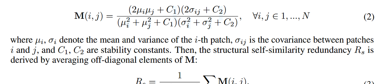 除了像素级的统计冗余之外,结构自相似性反映了由重复模式(例如纹理、几何特征)引起的空间冗余。为了量化这一点,我们利用结构相似性指数矩阵(SSIM)[70] 来衡量块与块之间的相似性。对于被划分为 N 个块的图像,SSIM 矩阵 M ∈ RN×N 定义为: