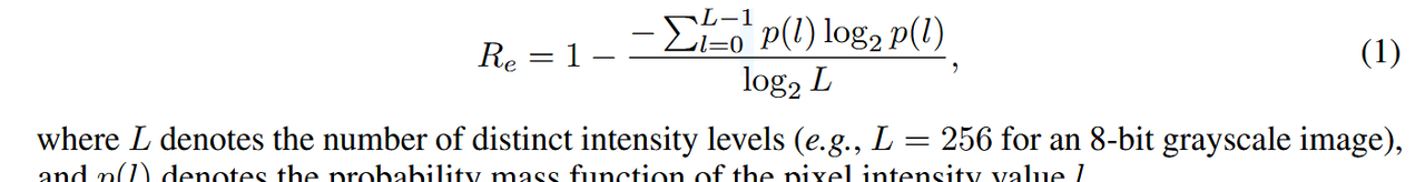 其中,L 表示不同强度级别的数量(例如,对于8位灰度图像,L = 256),p(l) 表示像素强度值 l 的概率质量函数。