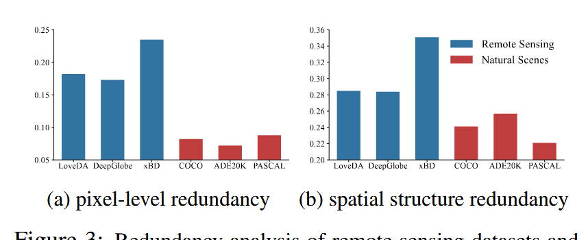 我们评估了六个基准数据集,这些数据集涵盖了自然图像(COCO [3]、ADE20K [93]、PASCAL [13])和遥感图像(LoveDA [67]、DeepGlobe [9]、xBD [15])的冗余性分析。如图3所示,我们的分析揭示了两个关键发现:1)遥感图像的熵冗余比自然图像高出1.9∼3.3倍,这表明其像素级的可压缩性更强。2)遥感数据的平均自相似性比自然图像高出42.6%,证实了重复纹理和几何图案的较高普遍性。这一见解为遥感图像语义层次理解中的积极令牌压缩提供了依据。