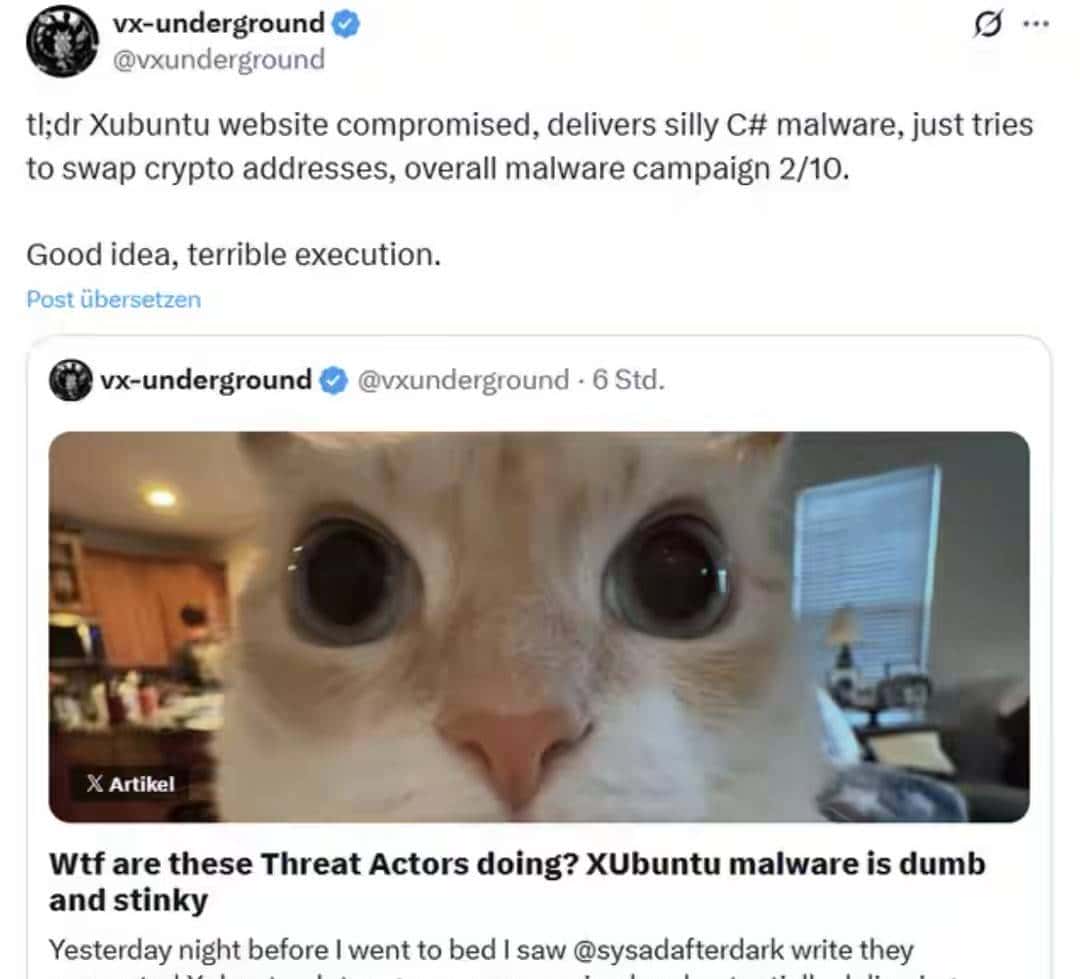这事儿最初是安全博主vx-underground发现的。他像往常一样打开xubuntu.org/download准备下载系统,结果解压后却冒出个Windows的exe文件。更搞笑的是,黑客在所谓的”用户条款”里居然写着”©2026 Xubuntu.org”,今年才2025年就露了马脚。(小编:这黑客怕不是熬夜搞入侵把年份都搞糊涂了?)