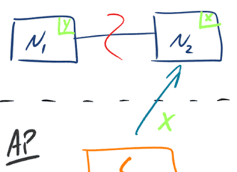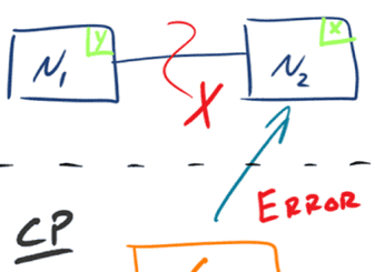 CP:如下图所示,,当发生分区现象后,N1 节点上的数据已经更新到 y,但由于 N1 和 N2 之间的复制通道中断,数据 y 无法同步到 N2,N2 节点上的数据还是 x。